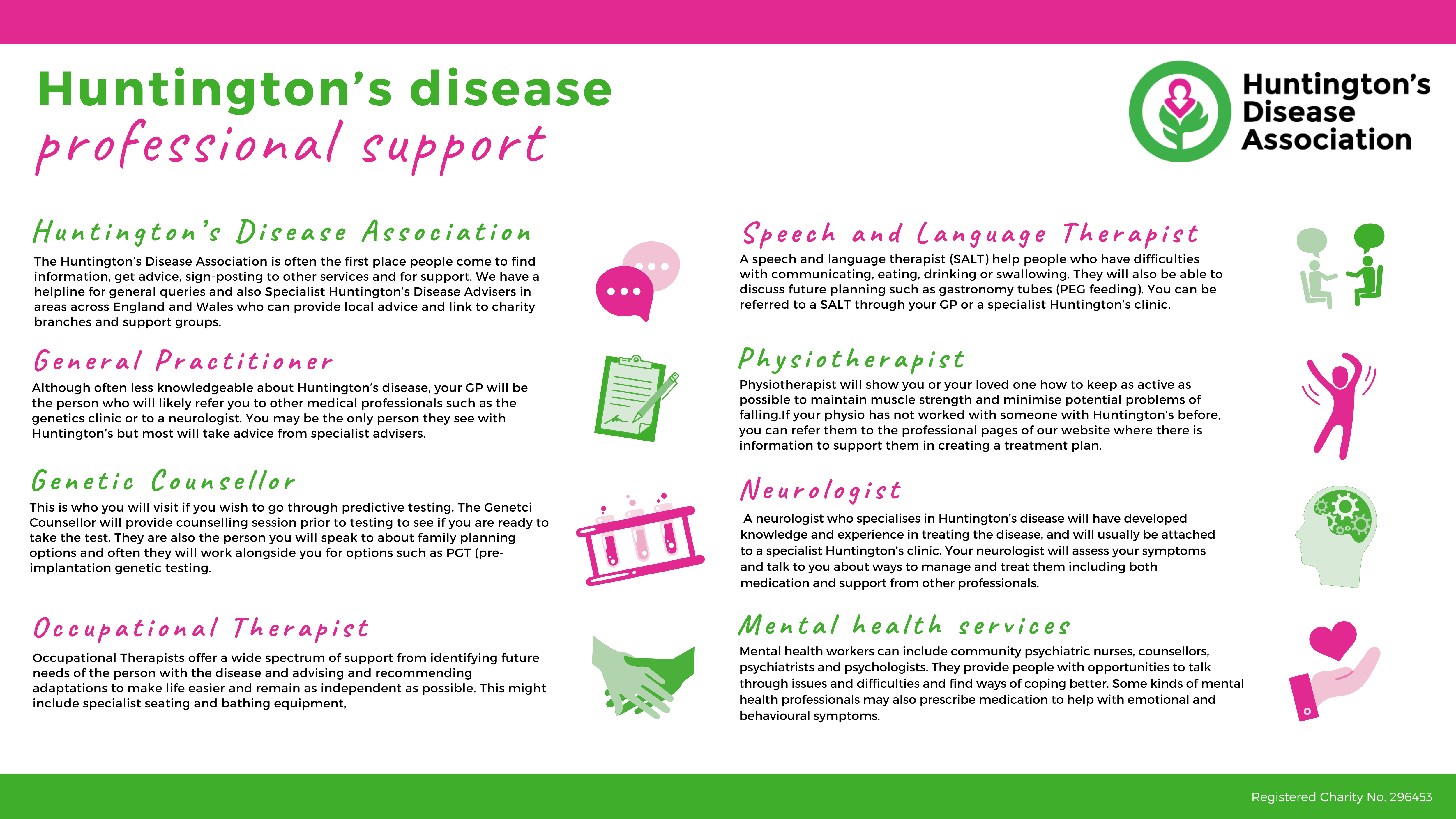 Professional intervention plays a key part in someone's Huntington's journey and getting the right support at the right time can make a big difference. From utilising our Youth Engagement Service (HDYES) for young people in Huntington's families, Genetic Counsellors for testing and family planning or Occupational Therapists for adapting to life with Huntington's. Never feel like you can't ask for help.
